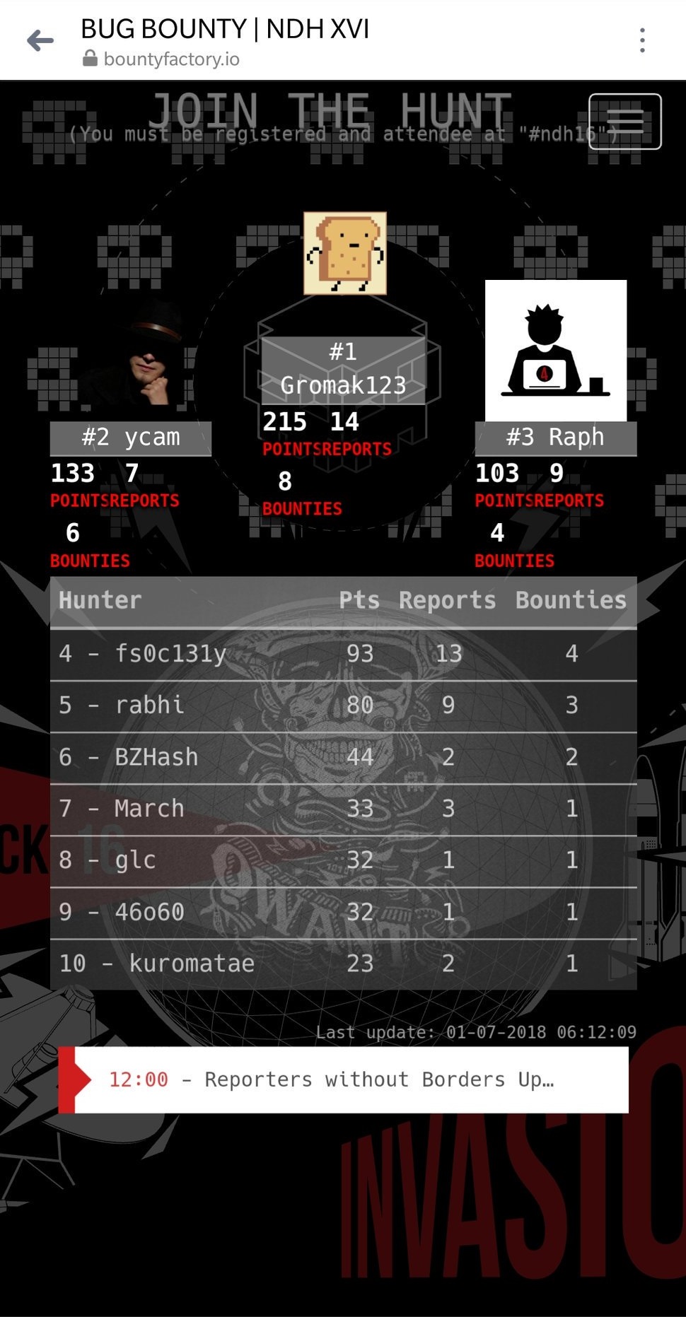 Jun 2018 Participation au Bug Bounty de la NuitDuHack / LeHack 2018 en terminant 🥈 2ème au classement général. | ||
