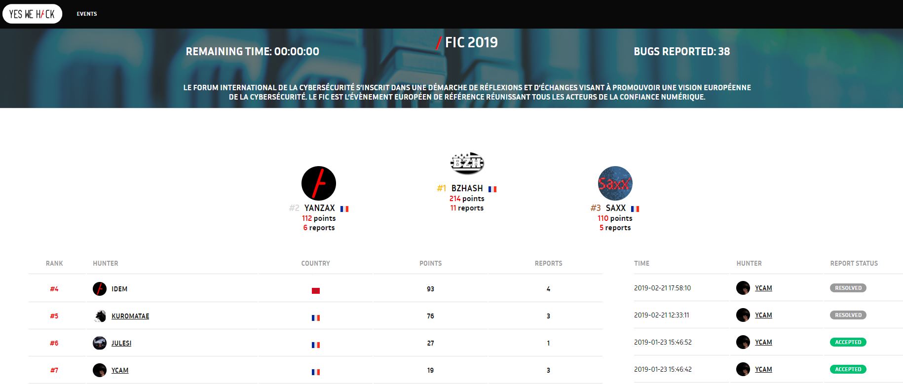 Jan 2019 Participation au Bug Bounty du Forum International de la Cybersécurité (FIC) 2019 en terminant 7ème au classement général. | ||
