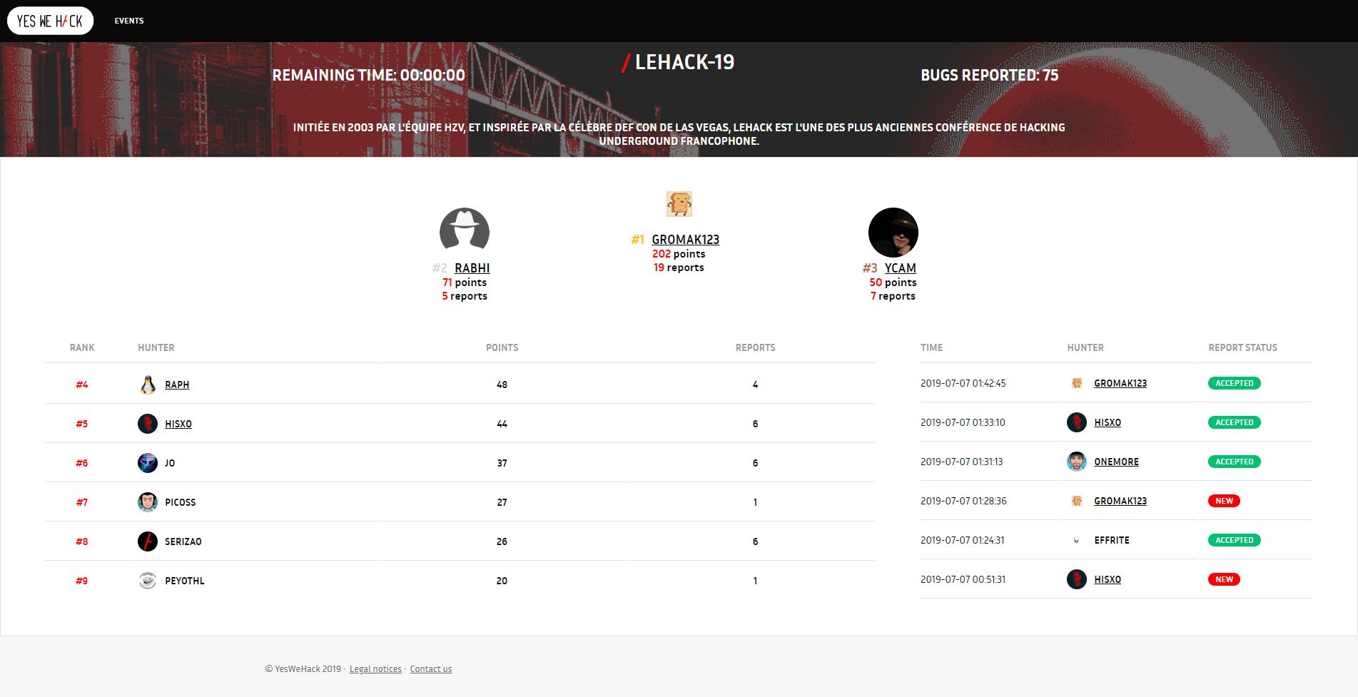 Jul 2019 Participation au Bug Bounty de la NuitDuHack / LeHack 2019 en terminant 🥉 3ème au classement général. | ||