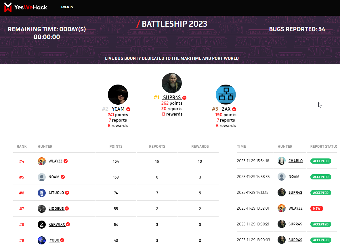 Participation au Bug Bounty YesWeHack de l’évènement BattleShip2023 (Live Hacking Event / LHE) en terminant 🥈 2ème au classement général. | ||
