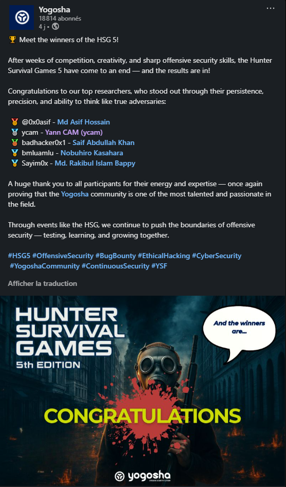 Jun 2025 - Oct 2025 Participation aux Hunter Survival Games 2025 (HSGv5) de Bug Bounty YogoSha en terminant 🥈 2ème au classement général. Cette compétition internationale, en 4 tours éliminatoires, s’est étalée de juin à octobre 2025. | ||